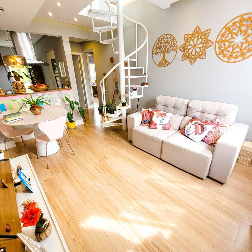 Dois quartos na parte térrea, sendo um suíte, e na parte superior uma suíte que pode ser usado com escritório , quarto ou ateliê + espaço gourmet, nascente total. Possuí armários na cozinha e no quarto, varanda e área de serviço.