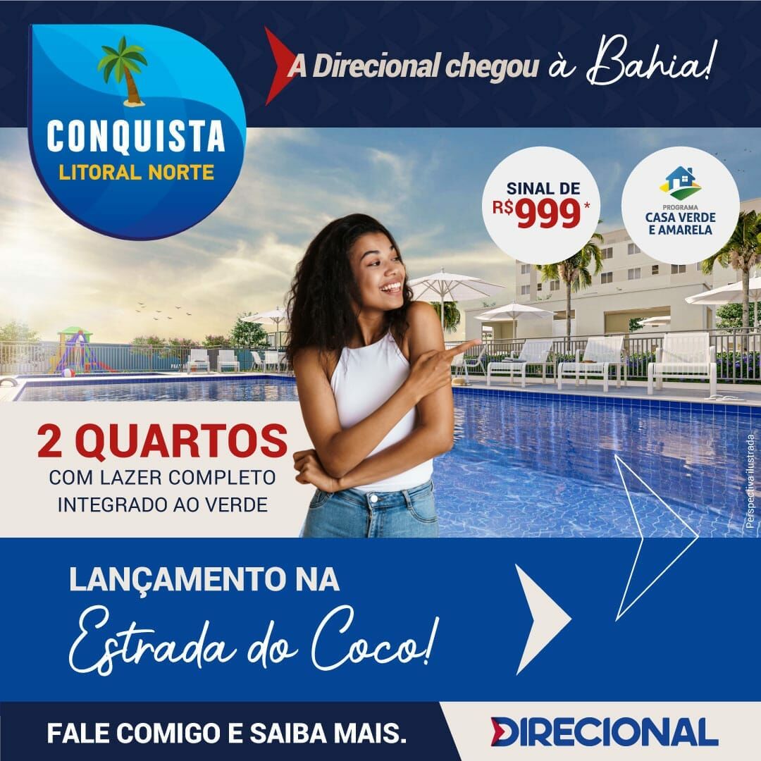 A Direcional está chegando a Bahia, a experiência e credibilidade de uma empresa que está presente em 14 estados do Brasil, agora entrega sua conquista na terra da alegria. Localização ´privilegiada , em estrada do coco, km 08, a 5 minutos do hiper Ideal Colégio D. Bosco e bem perto das lindas praias litoraneas ! ,Conheça o Conquista Litoral Norte, o bem estar da sua família em uma das regiões mais encantadoras do estado, more perto de tudo, e tenha diversão e contato com a natureza, Empreendimento conta com Lazer equipado e decorado pra sua familia !vamos conhecer o decorado , chama agente no zap 71 992050215